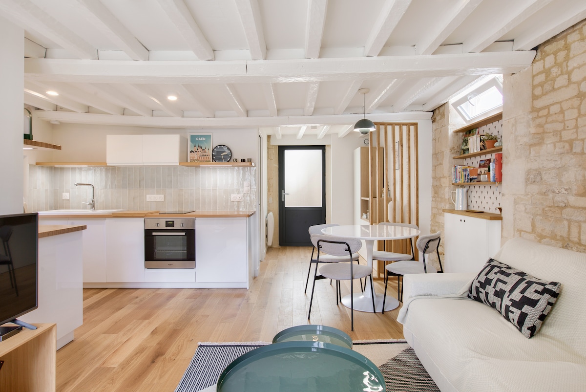 Welcome! Drop your bags in this charming, fully renovated duplex in an 18th century building in the heart of Caen's historic center and get into the rhythm of French art of living! Exposed stones, fireplace, Limoges porcelain and magnificent views of the steeples of the famous Men's Abbey will transport you to the time of William the Conqueror while offering you the comfort of a modern apartment.