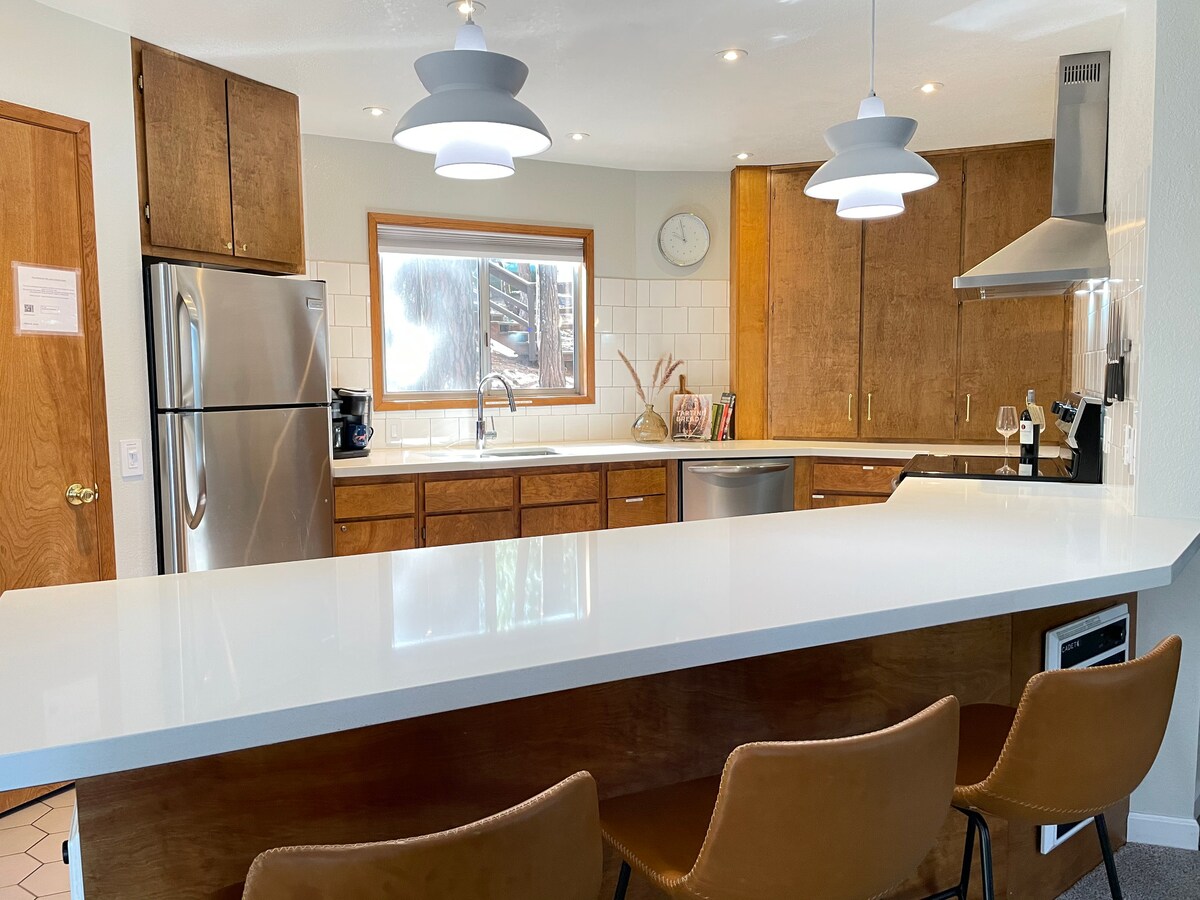 This cabin has been recently remodeled with high end furnishings and appliances in a quiet setting but close to the local amenities. Each bedroom has a California king-size bed and a Wifi connected smart TV. There is a 50" flat screen in the living room, 3 Sonos speakers to play your music and the kitchen is stocked with plenty of Williams Sonoma cookware, knives, and dishes.
