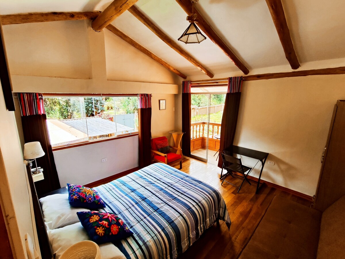 This cozy loft, located on the first floor of a country house, is perfect for travelers looking for comfort, good location and full services in the Sacred Valley. With large arched windows that connect to a garden of more than 600 m², the space is designed for you to enjoy a quiet and functional stay. Equipped with a kitchen, fast fiber optic internet (50 Mbps) and access to your favorite platforms such as Netflix, etc., you will have everything you need. #ElValleDorado