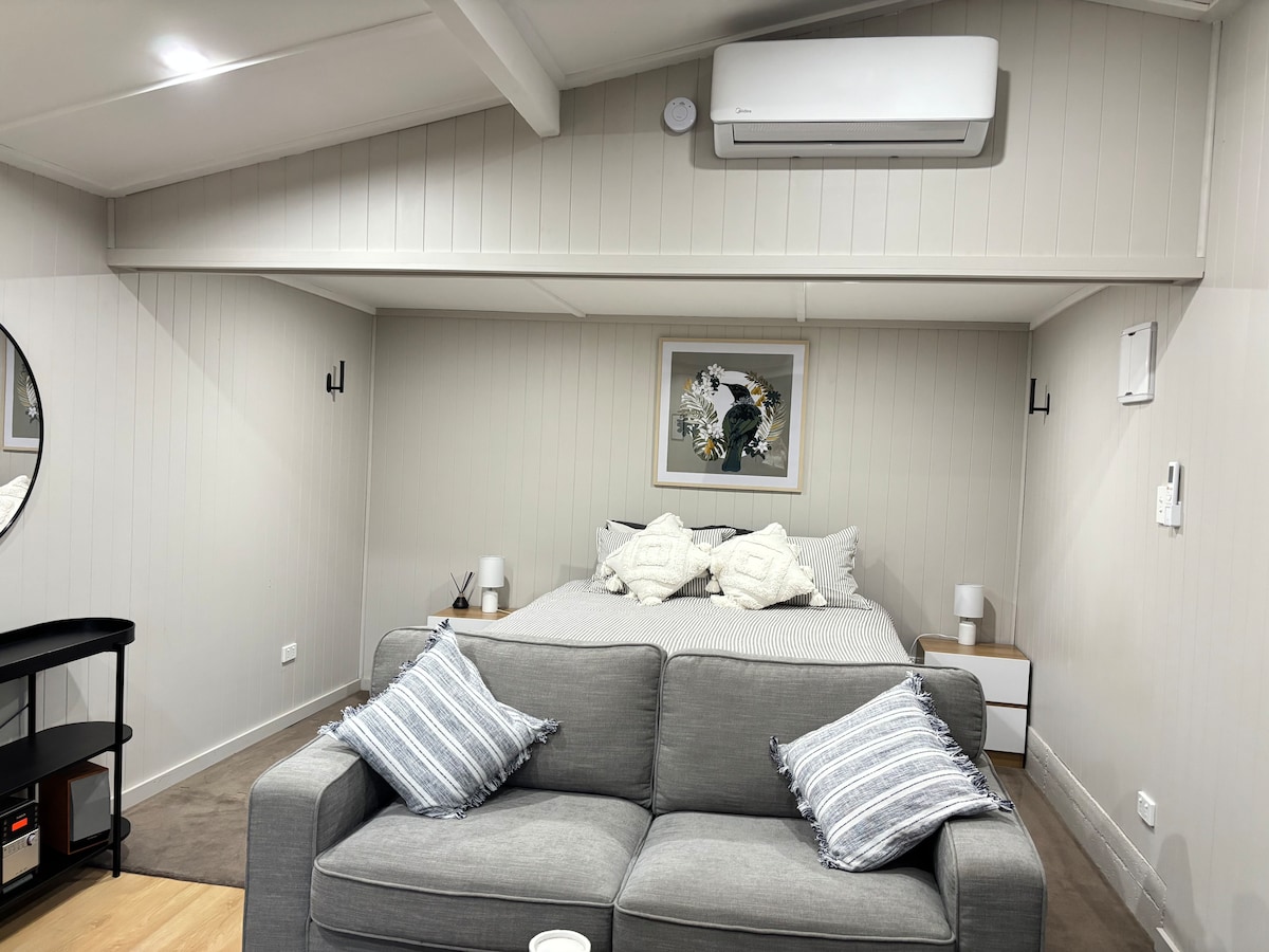 Inside our spacious newly renovated Black Cottage, you have a small full kitchen with farmhouse sink, large fridge/freezer, gas cooktop, microwave, air fryer, and Nespresso. In the lounge area there’s a smart screen tv- Netflix . Through the slider barn door to a large bedroom with plush king bed, laden with luxury linen and a walk in wardrobe leaving you ample space,+ comfortable reading chair. Walk though to the walk in tile shower, handbasin and toilet- there is also a Laundry in your room.