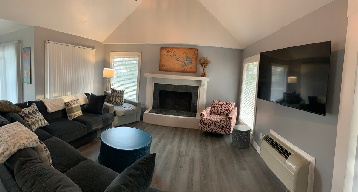Sit by the fire & relax while enjoying views of Lake of the Ozarks. Nestled in the beautiful Tan-Tar-A Estates/Margaritaville-resort, our 2 bed/2 bath lake house is great for couples or a small family. Fully stocked kitchen w/updated appliances, 65" TV in family room and TV's in both bedrooms. Covered front porch and BBQ grill. Nearby amenities (for additional fee) will keep you busy w/ seasonal pools, golf courses, indoor waterpark, golf, horseback riding, marina, fishing, hiking and more!