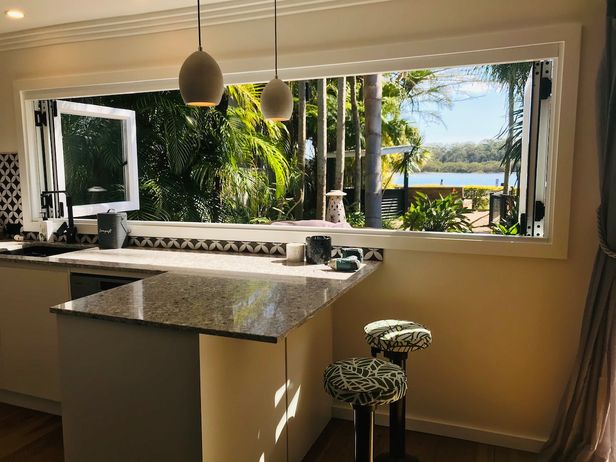 Stylish modern self-contained unit adjacent to the river, enjoy the water views from your private deck. Located just a short walk to cafes, restaurants, club and pub. 5 minute drive to beaches. Unit has free wifi, Netflix, dishwasher, under bench fridge and freezer, microwave, oven and cooktop. Tea, sugar and pod coffee system provided. Private bedroom with queen bed, bathroom separate toilet. Fans in every room with air-con throughout. Linen, hair-dryer, iron and ironing board provided.