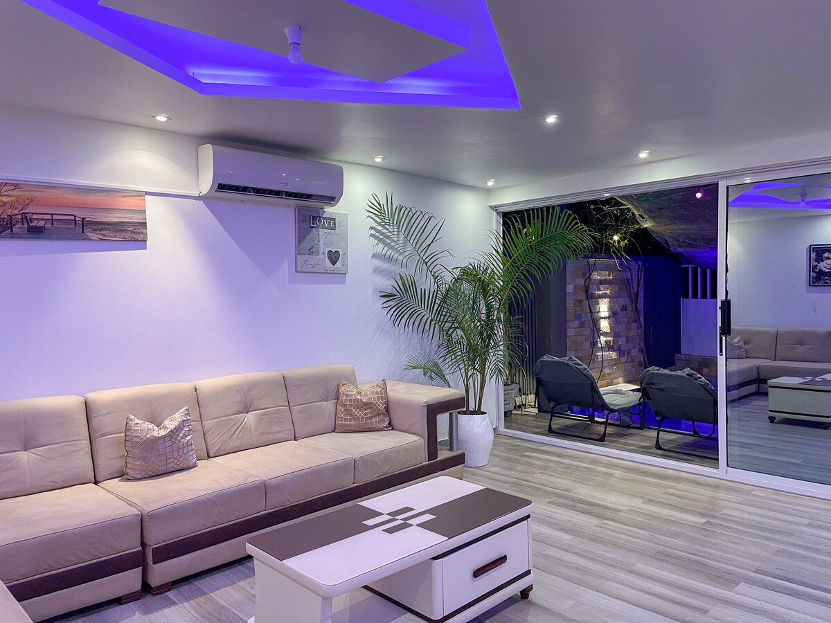 High standing duplex with 4 bedrooms, one on the ground floor, ideal for families or groups. Enjoy 3 modern bathrooms, a huge bright living room, an infinity pool, a cozy movie area and a large equipped kitchen with a dining room on the terrace. Calm, absolute comfort and premium services in the heart of Yassa – Cité Chirac.