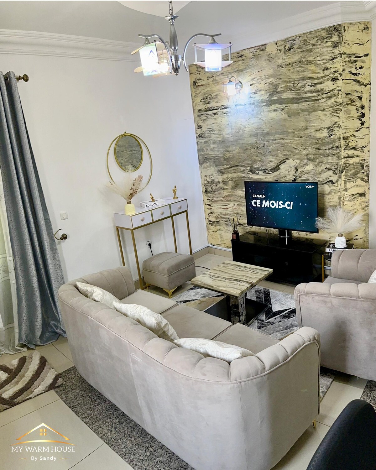 Welcome to your modern, secure, and high-end 2-bedroom apartment in Douala, located in a new building on the border between Bonamoussadi and Kotto. Ideal accommodation for business travelers, couples, and families. Located 50 meters from the main road, before the MRS Kotto station, and approximately 500 meters from Santa Lucia Bonamoussadi. Key points: - Generator - Wifi - Air conditioning is available - Keeper - Parking - TV with Canal+ and Netflix - A washing machine - Housekeeping service.