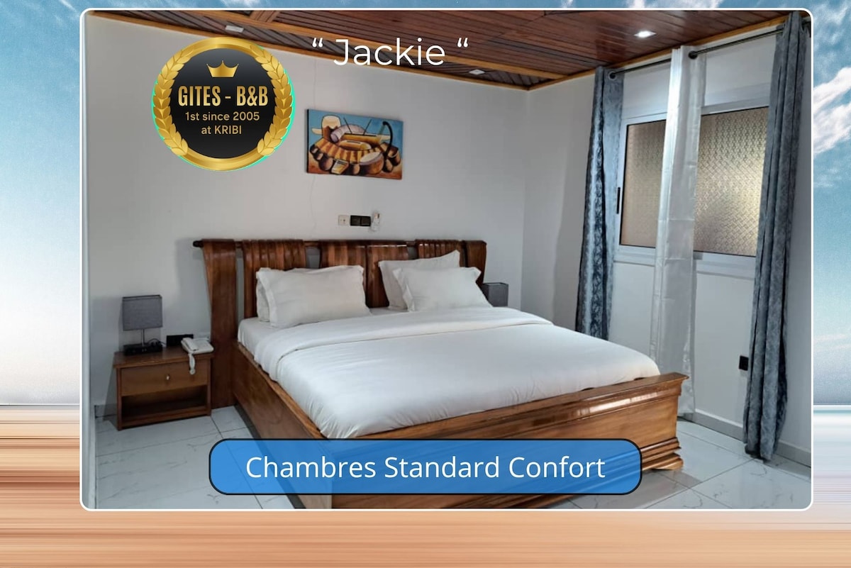 Comfort Rooms – Simplicity & Comfort close to the private beach Located in the heart of Kribi, the Standard Comfort Room at Les Gîtes de Kribi combines simplicity and comfort. It features a double bed or two single beds, a private bathroom and air conditioning for a pleasant stay. Guests enjoy quality bedding, TV, free Wi-Fi and a secure environment. It’s an ideal base to explore Kribi’s beaches, waterfalls and local culture.Vous adorerez le souci du détail apporté à ce logement chic.