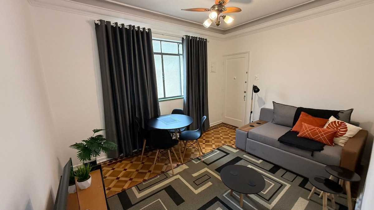 Modern 1-bedroom apartment and recently renovated on Avenida da Praia, near channel 4, with a side view of the sea and next to bakeries, markets, restaurants, bars and everything you need a few meters away. We are just a 10-minute walk from Shopping Praiamar and Praiamar Corporate, and in an excellent central location for those who need to get around Santos.