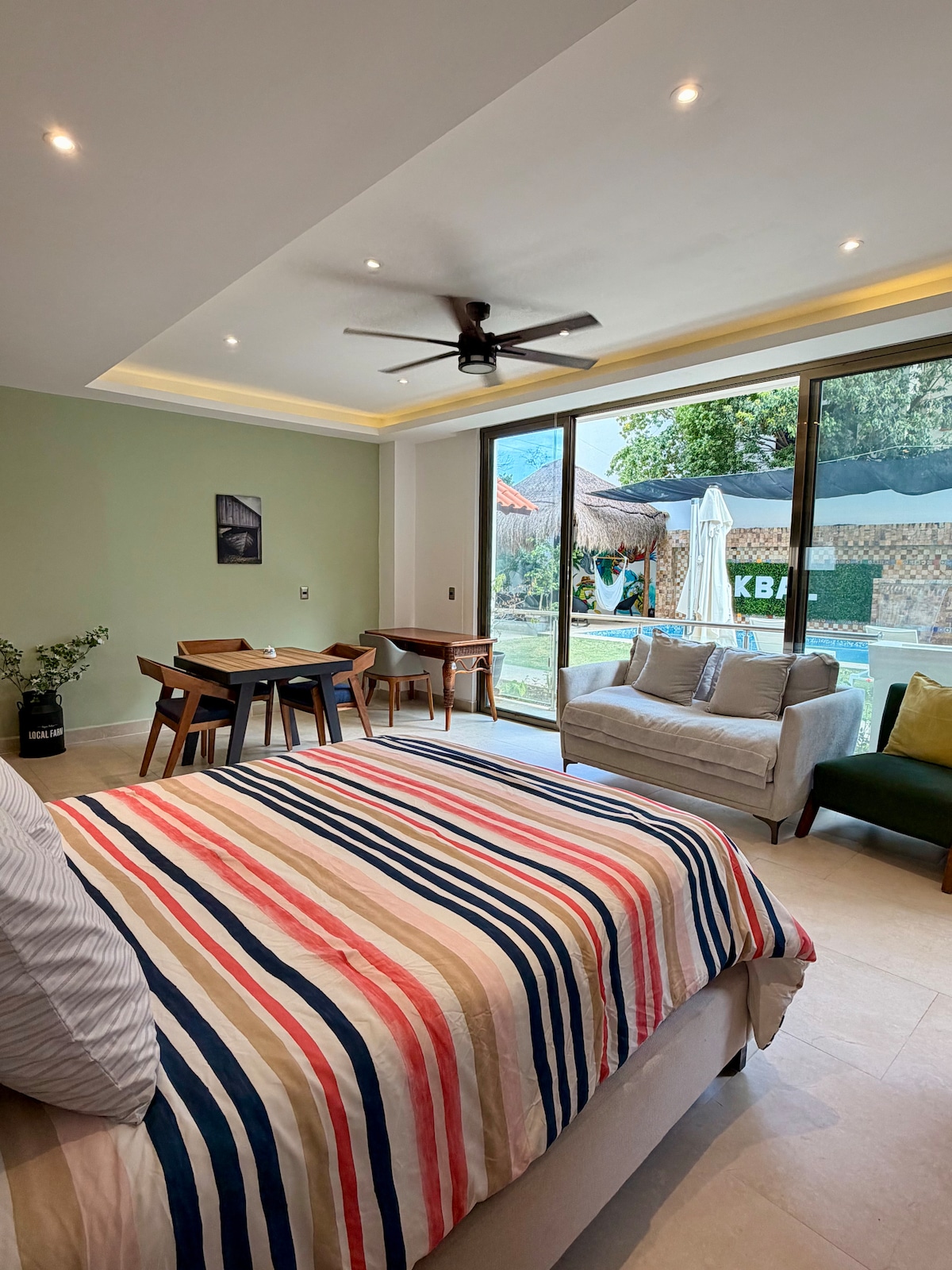 Stylish studio with amazing views, located in a 3 tower condo-hotel, pristine private beach, turquoise water, white sands. Huge wrap around balcony ocean and lagoon view. High speed Wifi, A/c, Smart Tv , safe. Lounge chairs and tents for free at pool and beach. Gym, tennis court, Coffee shop at lobby. Spa (with extra fee) Flexible All Inclusive Option for food and drinks -Pay only for the day(s) you want it-. Decide as your vacation unfolds.(today $95 usd p/p per day) ideal for couples