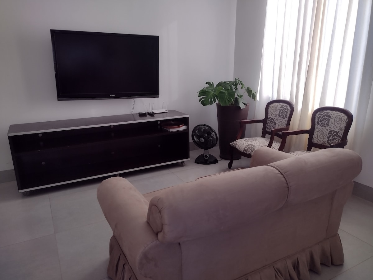 Desfrute de um ambiente aconchegante: Quarto com ar condicionado, tv com canais abertos, Netflix, Youtube, cama de casal e um confortável sofá-cama para você usar como sofá ou como cama. Cozinha e Lavanderia completa(ver itens em "comodidades"). Banheiro= Se destaca pela beleza e qualidade com um bom chuveiro para seu Banho. Garagem para 1 carro com portão eletrônico. Estaremos à sua disposiçao para atender você e sua família. Venha com a gente.
