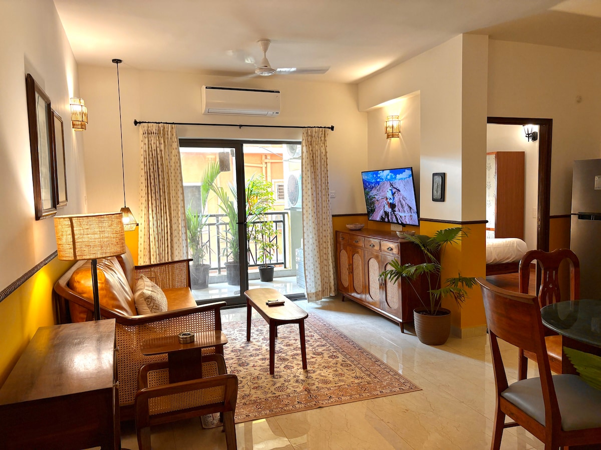 1BHK Tropical view Apartment in Candolim Enjoy a relaxing Goan getaway in this bright and Luxury 1BHK apartment with a balcony overlooking the tropical view and lush green courtyard. The space is designed for comfort, style, and convenience perfect for couples, families, friends or solo travelers. What You’ll Love: Fancy Bedroom Cozy Living area Spacious Dining area Fully equipped kitchen Spacious bathroom Access to Swimming pool, GYM and Yoga centre ,Pool table. Reserved parking