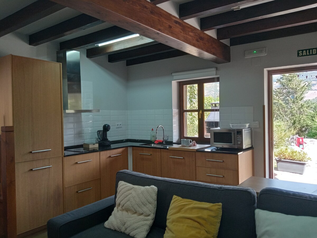 Charming 50 m² rural suite with exposed wooden beams, offering stunning views of the mountains. When the sunny days arrive, take full advantage of the raised wooden terrace: a space suspended between sky and valley, perfect for enjoying a coffee at sunrise, sharing a drink facing the sunset, or preparing a delicious outdoor barbacoa while breathing in the tranquility of the surrounding nature.
