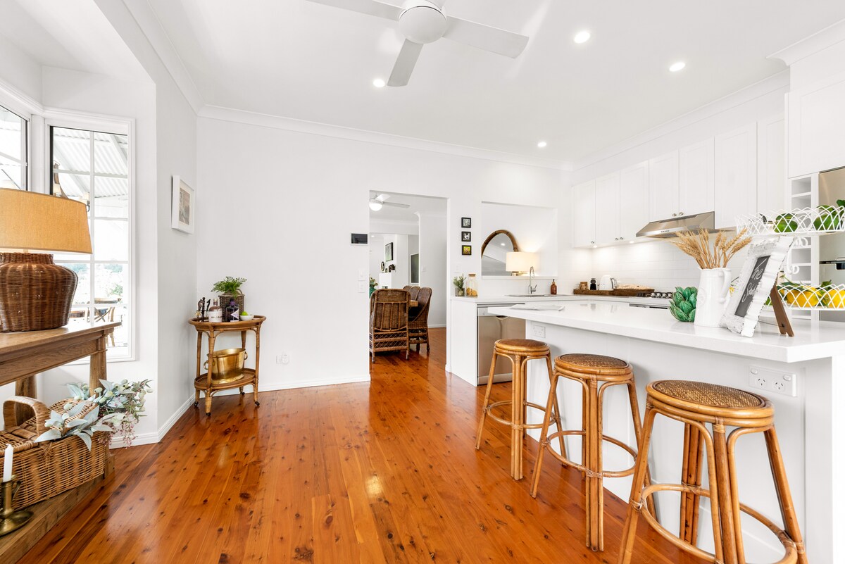 The unique cottage sits in a quiet street in North Tamborine surrounded by national parks. The property boasts hand made windows, hand carved etchings and joinery and stonework that will leave you in awe and exploring for days. It's a short drive to the rainforest walks, brewery, wineries, artisan cheese factory, the famous Gallery Walk, wedding venues and many other local restaurants and attractions of Tamborine.