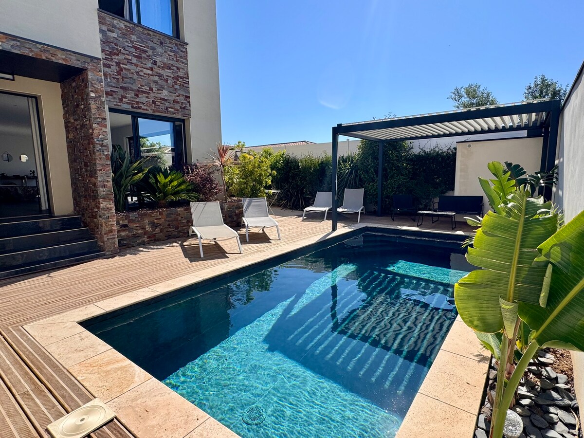 Beautiful brand new single-story villa 500 m and 10 min walk to the sea in a residential and very quiet area. You will find a garden planted with Mediterranean species and a magnificent salt pool (7*3) + a beach of 7*2 (40 cm of water) ideal for children. 3 bedrooms with closets 2 bathrooms with showers 2 powder rooms Fully equipped kitchen Cellar with washing machine Parking inside the villa.