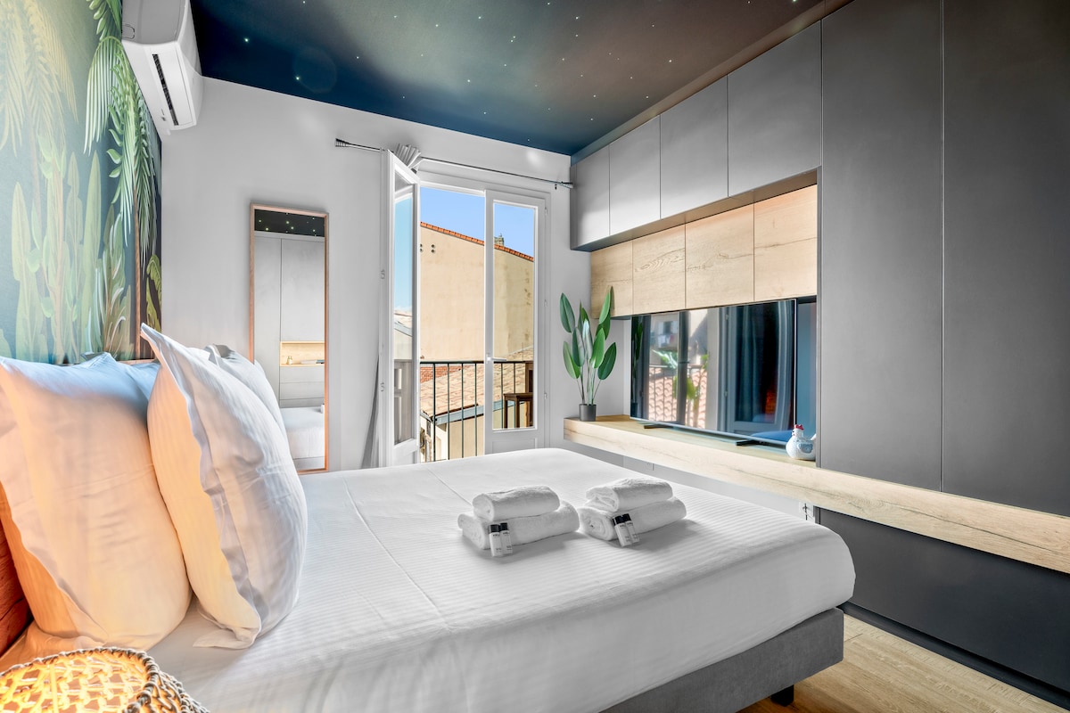 Stunning unit with 2 bedrooms and 1 bathroom (and a separate toilet) with direct view on the sea, the beach and the mountain. With all modern amenities (AC, WIFI, APPLE TV....) and beautiful decoration, this property has everything: a well equipped kitchen (washing machine and separate dryer), large sitting-room, great dining-room. Linen and towels are provided with sample cosmetic items. Located in the heart of old Antibes, it is close to the train station, buse and the provencal market!
