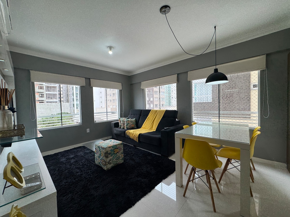 One-bedroom apartment, spacious, well-lit and ventilated. It has a closed and covered garage, gas heating, barbecue, air-conditioning, ceiling fans and accepts pets. Great location, close to pharmacy, market, cafeterias and square. One double bed, extra mattresses and sofa. Fully equipped kitchen. Apartment near Flávio Boianovsky Square. Apartment with 110V voltage. You don't need to use the car for almost anything. We have chairs, a sun umbrella and a cart. It has Wi-Fi.