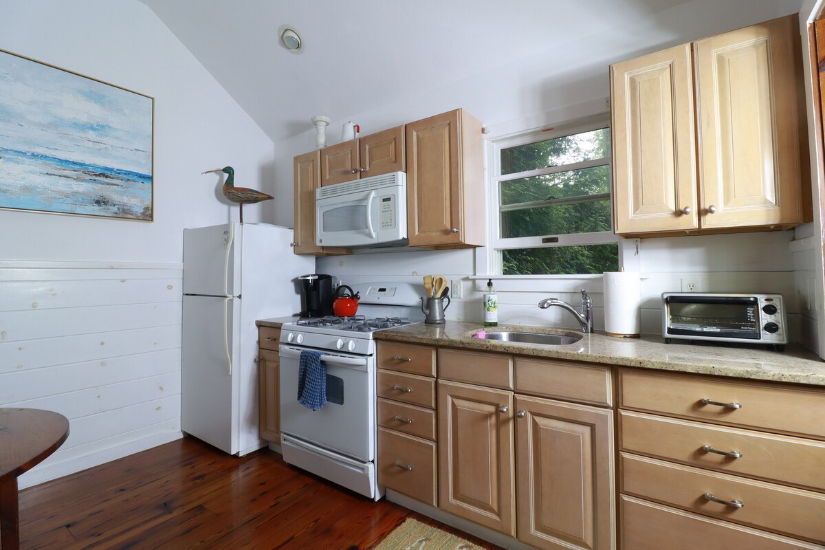 Couple/family fun all year in a charming, private Cape Cod cottage w/ screened in porch, patio & outdoor shower (in Nov/Dec/Jan becomes a Gingerbread cottage). Inside: open living space w/ queen bed & sitting space. Ladder leads to a short height sleeping loft w/ 2 twin beds. Full bathroom w/ indoor shower. Kitchenette- see description below. We supply tea, local coffee, spices, condiments, gas grill, ice chests, beach towels & chairs. To sleep up to 8, also rent our Upper Room on Airbnb.