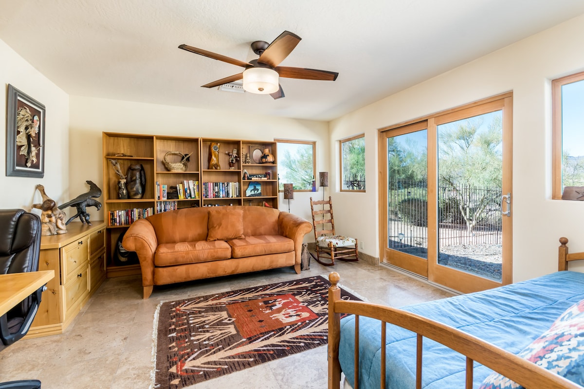 Come, stay at Correcaminos our hidden little Sonoran gem in the town of Carefree. Walk out in the morning and pick your fresh lemons or grapefruit and sit outside and enjoy your morning coffee listening to the birds. Enjoy the pool or hot tub and take in the mature landscape and mountainous views. Town is just a half mile from the house and Cave Creek is right next-door. Shopping , restaurants, hiking, golf, spas, and bars, (even a rodeo) farmers markets, art and wine all within walking distance