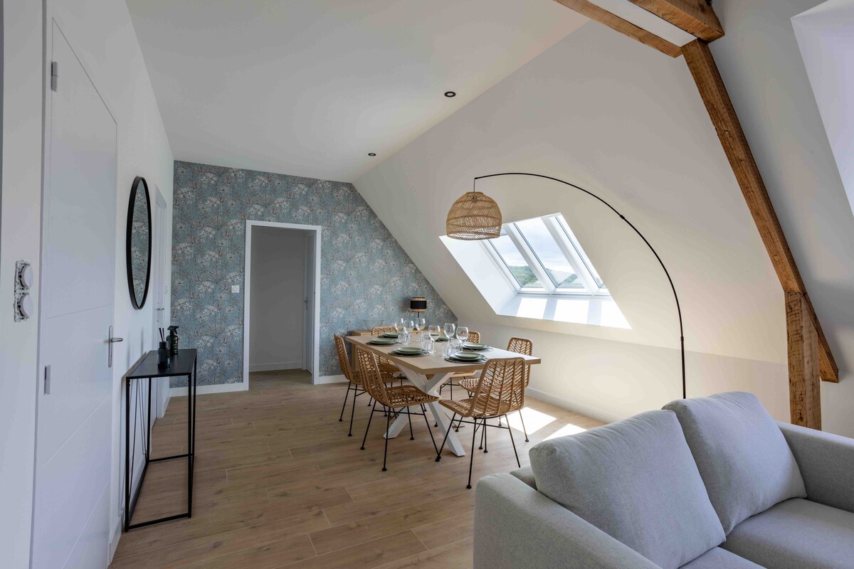 Bedding and towels are provided! A bike storage room is available Welcome to our bright cottage with its rooftop and its view of the forest 500 m from the village, you can take the time to walk through the flowery streets and discover the pictures and the talent of its craftsmen. Please be careful, the stairs are quite steep for an elderly person