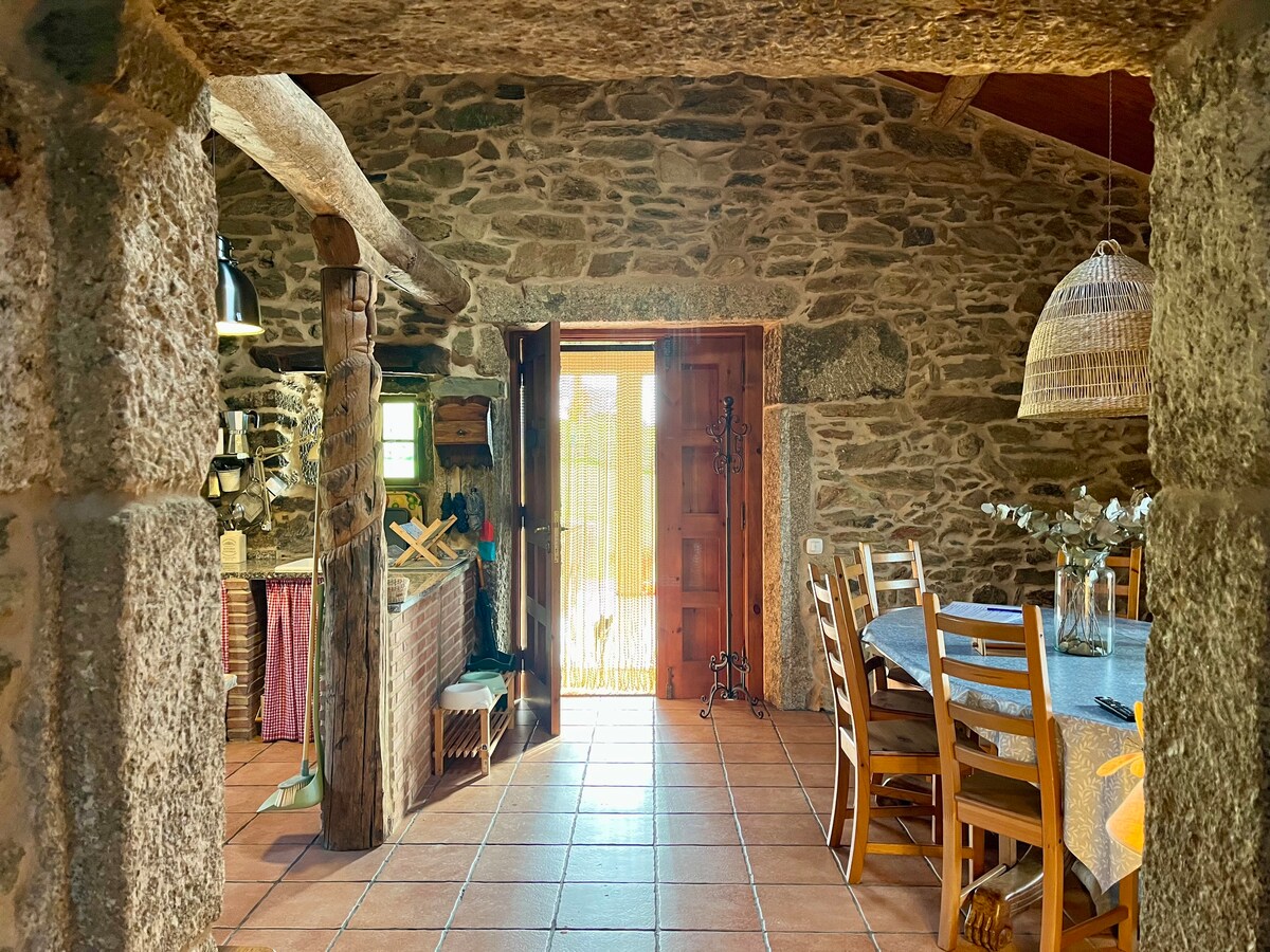A newly restored 1880 stone house, creating a unique and organic design between its stone walls and its roof with large wooden beams. It stands out for its fantastic views of the Castrelo de Miño reservoir. It is located in the heart of Ribeiro, 2 km from Ribadavia. The Prexigueiro Thermal Spa is 10 minutes away, and there are also several hiking trails. Nearby wineries offer guided tours. Ourense is 28 km away, Vigo airport is 67 km away, and Santiago airport is 120 km away.