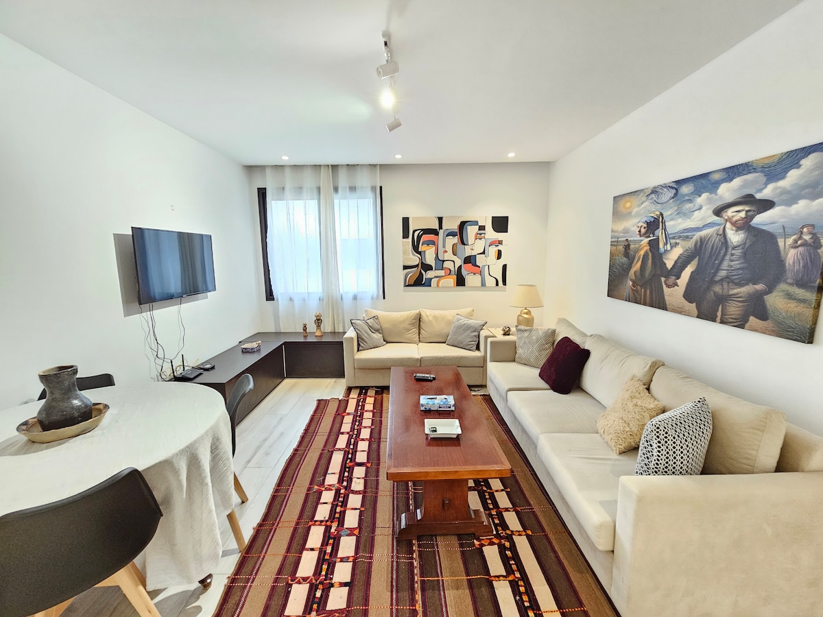 Enjoy a newly constructed, modern and stylish apartment at a centrally-located place in “Banlieue”. Its tooth picked design and decoration makes your stay on whole another level. Just kick back, relax in this calm, stylish space and let us “serve” you. By car: 4 min to Marsa Corniche and beach, 5 min to Sidi Bou Said and Gammarth, 8 min to Lac II, 13 min to the Airport, and 15 min to downtown Tunis. Walking: Coffee shops, bakery, pharmacy… One of the best and sought after location.