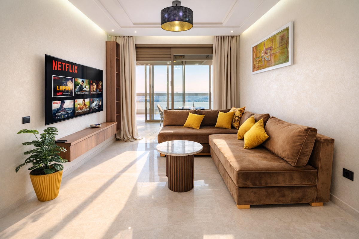 Favorite Enjoy your stay in this peaceful, brand new, clean and comfortable apartment, ideal for business trips and sightseeing, perfect for couples. Located in the heart of Casablanca, everything is within easy reach, and the tram station is only a 1-minute walk away. The apartment has a comfortable bedroom, impeccable bathroom, fully equipped kitchen and bright living room with large screen TV and two balcony terraces.