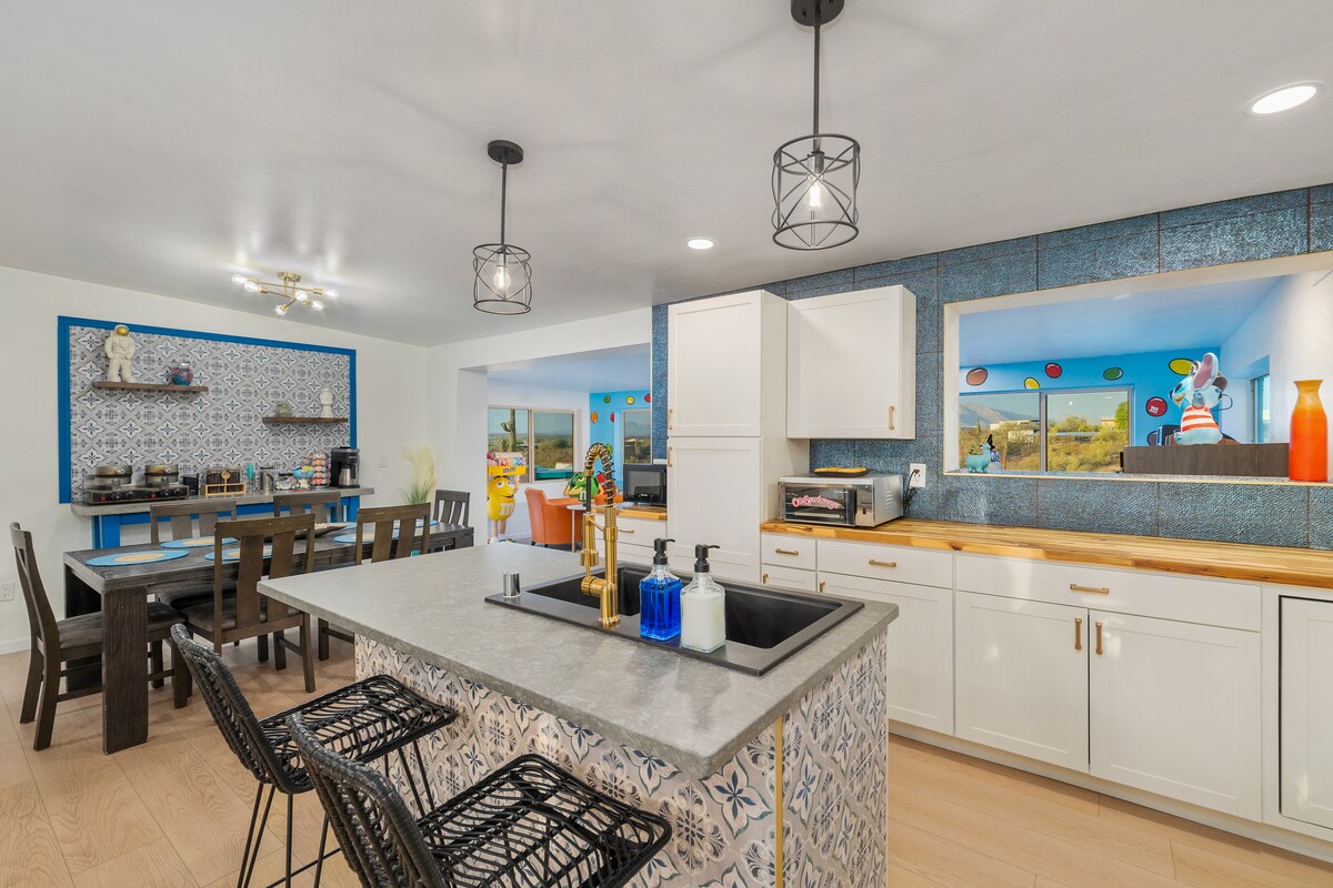-Amazing Stargazing -Stunning mountain views -Waffle/Coffee Bar. -Wildlife -ABSOLUTELY NO PARTIES, pets or smoking in house. 8 GUEST MAXIMUM -Parking for 3 cars only. -Iconic saguaro cacti -Pool (NOT HEATED) -Hiking @ Saguaro National Park West -Foosball, Skeeball, Arcade games -BBQ Grill & grilling tools -Fully equipped kitchen -University of Arizona 15 minutes -Memory Foam Mattresses -Please read house rules before booking