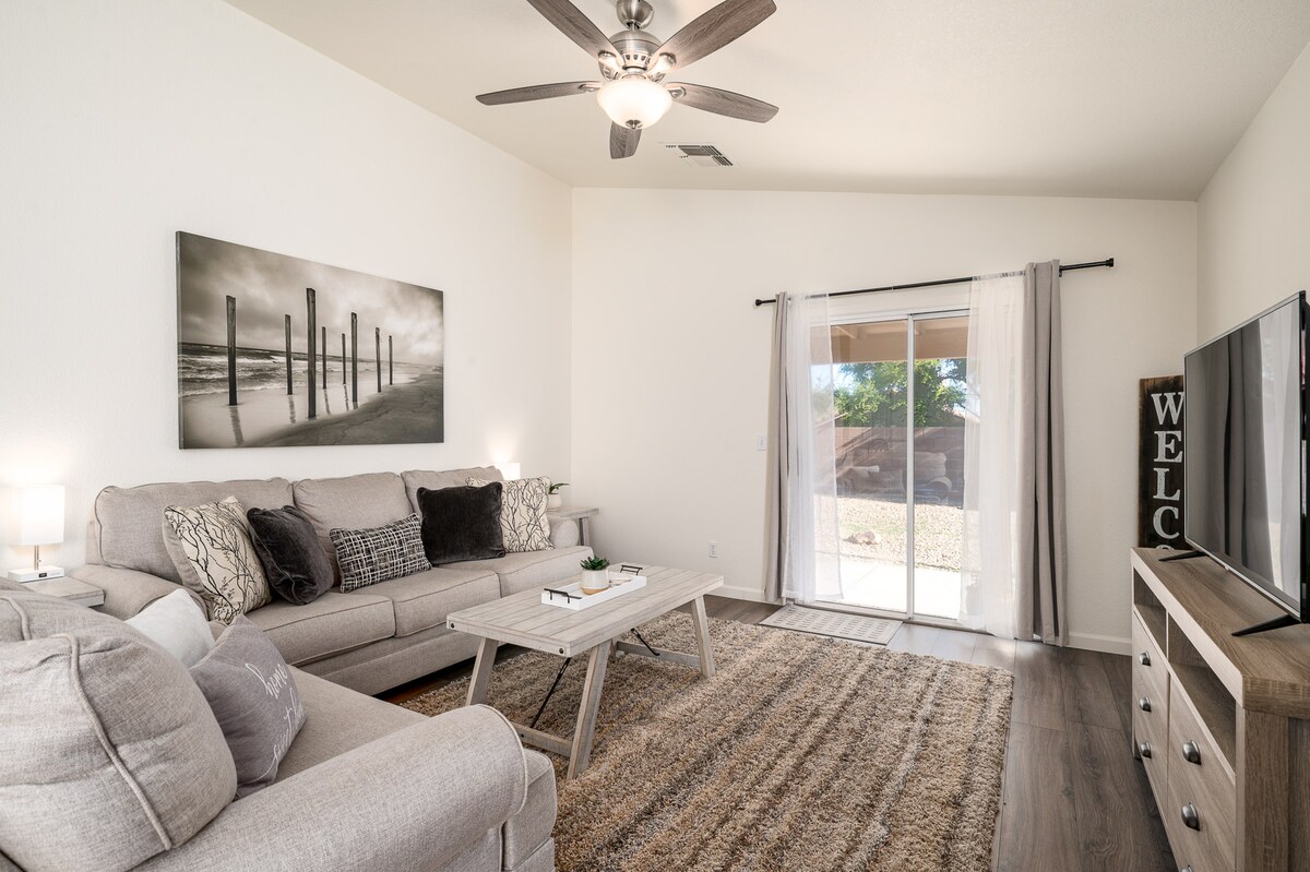 Whether you're seeking a peaceful getaway or a vacation filled with exploration, this wonderful vacation home is ready for you! The home is lovingly maintained with comfy beds & sofas, soft linens, fast Wi-Fi service, dedicated work space, Smart TVs, a well-appointed kitchen & ample space for guests. The spacious, private backyard is perfect for your furry friends! Located in a quiet neighborhood amongst mountain views, trails, 81-holes of golf, shopping, dining & entertainment.