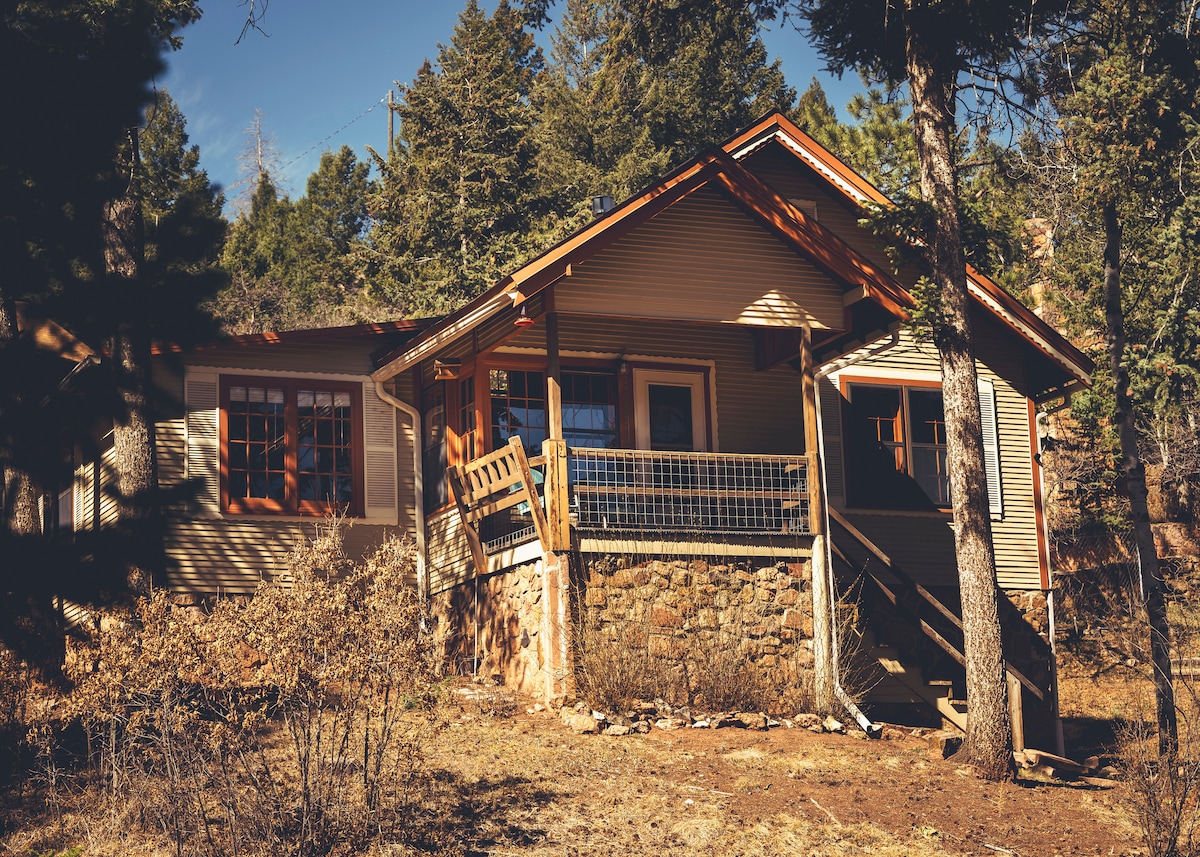 This historic rustic log cabin built in 1953 has been updated. It sits near the foot of Pikes Peak and Pike National Forest & 17 minutes from Downtown Colo Spgs. The cabin sits at 7800' and is usually cool and comfortable temperature inside, we have added Central Air Conditioning to further enhance your comfort. Denver Airport (DIA) is a 90 minute drive Colorado Springs Airport (COS) is a 32 minute drive. Hiking, Fishing, Kayaking, Garden of the Gods, North Pole Santas Workshop, USAFA,