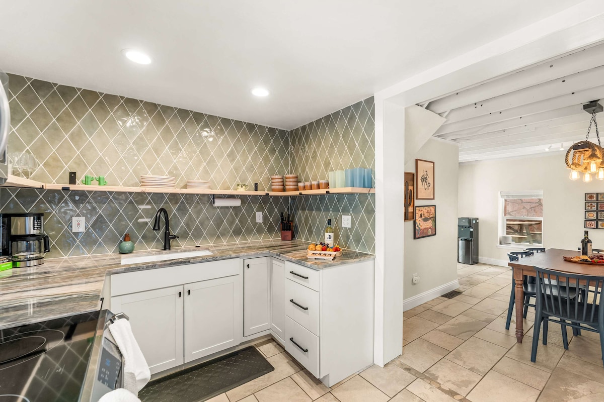 This southwestern boho cabin is tucked amongst the trees in a historic, quiet neighborhood at the foot of famed Pikes Peak. With an ample front deck, floor to ceiling windows, and a private, fenced back yard with hot tub, gas fire pit and s'more fixings waiting for you on arrival, the cabin has wonderful forest and mountain view while within 10 minutes of culture and conveniences in Manitou and Colorado Springs. The place to get away for a romantic retreat, family fun, or a working vacation!