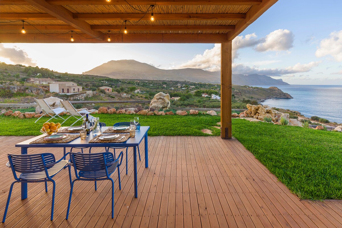 You will stay on the ground floor of my villa, a 3-minute walk from the sea, consisting of two separate apartments. *You will not share all outdoor spaces with other guests*. The apartment has a large outdoor space with a dining table, sofas and deckchairs, and private parking. The villa is located in one of the most picturesque areas of Scopello, 200 meters from the beautiful beach of Cala Mazzo di Sciacca, and is surrounded by a large tree-lined garden and a picturesque sea view