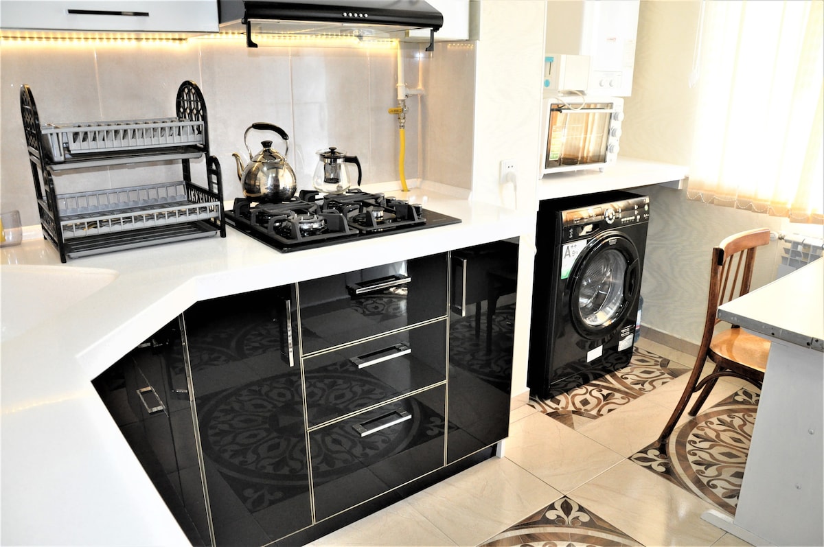 Wake up to stunning city and Caspian views in this newly renovated White City apartment in the heart of White City, next to COP29. Enjoy a king-size bed, a private balcony with an egg chair, and a bright living space with an 85” TV, Xbox, and a fully equipped kitchen. Relax with fast Wi-Fi, A/C, and an in-suite washer–dryer. Guests also have free access to a gym, table tennis, and a pool table. Cafés, shops, and a peaceful park are just steps away.