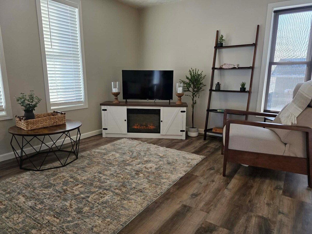 Tranquil getaway with home comforts including furnished kitchen w/appliances, Farm style seating for 4, reclining loveseat, queen bed, beautiful bathroom. Cute front porch, side patio w/table for six, portable firepit. Surrounded by trees/privacy fence. Available year-round. Queen bed, linens/towels. Housekeeping not provided unless the stay is more than one week. At that time, we will clean the linens/towels & entire space & charge an additional $25. Same weekly pattern for extended stays.