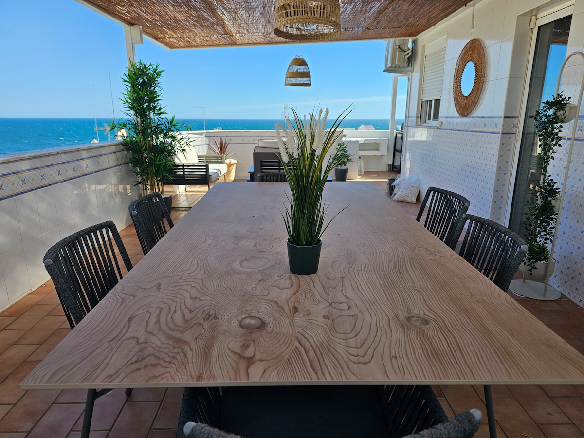 Stunning apartment in Quarteira, one of the most famous seaside areas in the Algarve. With a Mediterranean style and touches of rustic and minimalist design, it offers a 180º direct view of the sea and immediate access to the boardwalk and beach. It is surrounded by cafes, bars, restaurants, and supermarkets. Only 15 minutes away are the exclusive Vilamoura Marina, Vale do Lobo, and Quinta do Lago. Fully equipped, it features WiFi, a Smart TV with Netflix, YouTube, and Amazon Prime.
