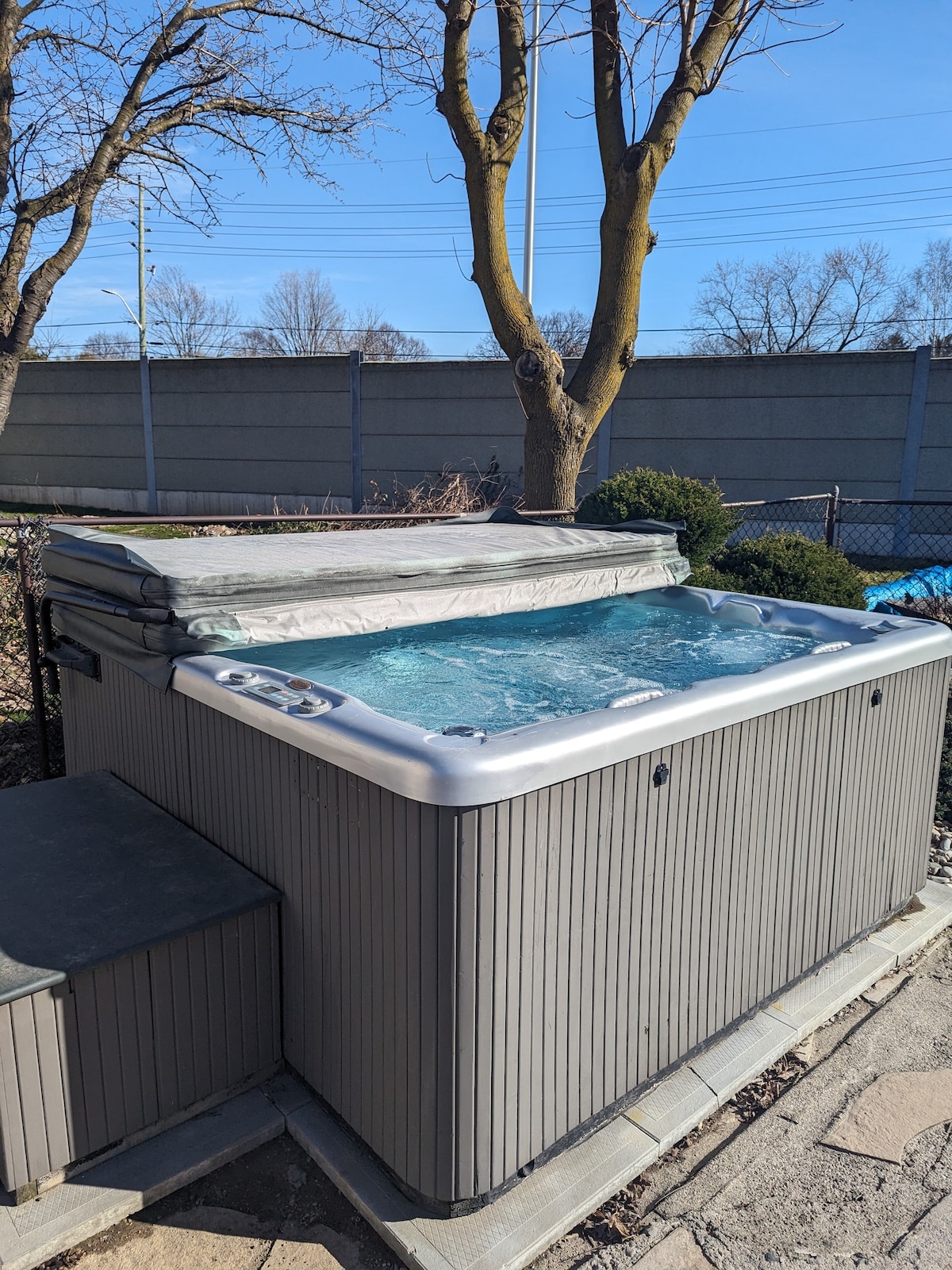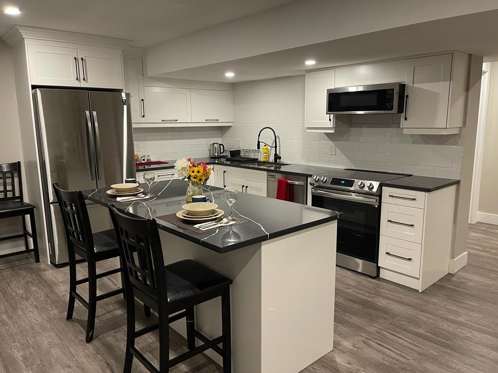Welcome to our retreat in west London! This stylish Two-Level Basement Split is a guest suite ideal for friends and families. Our 1+Den has 2 comfy Queen Beds, 1.5 bathrooms, a large kitchenette with every appliance you need, and a foosball table for some competitive fun. Outside, there's a hot tub, firepit (BYO wood), BBQ, and outdoor eating area. We live upstairs and are available to assist with the indoor or outdoor amenities at any time!