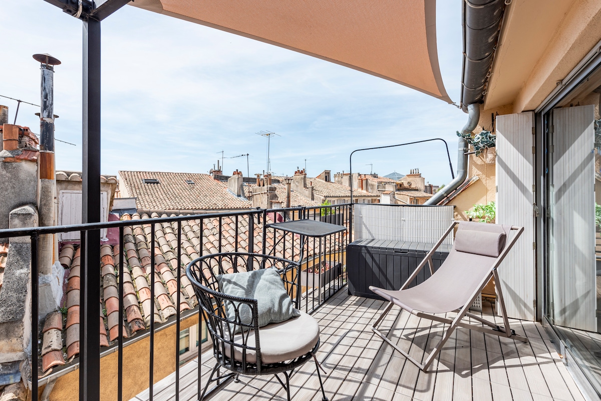 Enjoy a centrally-located place. Everything is close by. You are 50 meters from Cours Mirabeau, on a pedestrian shopping street. The terrace and bedroom are duplex, accessible by a miller's ladder, they have magnificent views of the rooftops of the old town. The bedroom is air-conditioned. 3 floors without elevator access. Bow-Window in the living room.