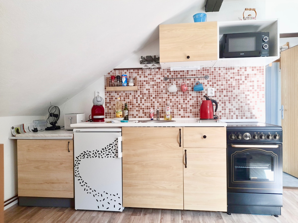 A quiet, romantic apartment right in the center overlooking the castle has original renovated wooden floors, there is a fully equipped kitchen with appliances and a coffee machine. The apartment has its own bathroom with a toilet. SMART TV with Netflix and strong WIFI. Smoking is forbidden! DOGS are also NOT ALLOWED due to the historic floors. The apartment is designed as a partially separated room with a double bed and a kitchen with a small couch, where another person can sleep if necessary. Elevated ground floor, 7 stairs.