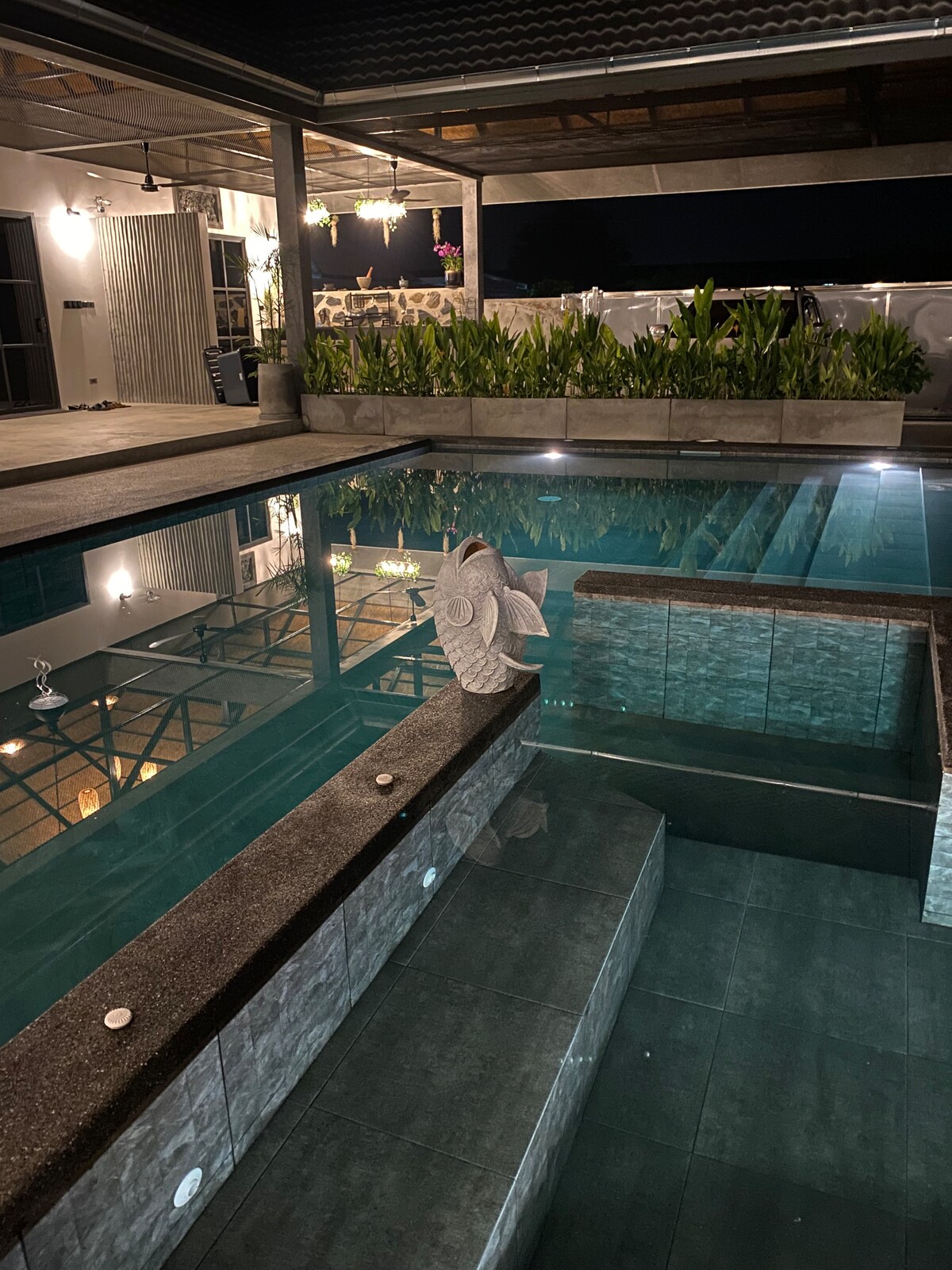 A pool villa that meets all your needs, designed for the happiness of everyone in the family, to make your vacation complete at all times. - Saltwater swimming pool, cleaned daily - International standard slide, fun and safe. - Cool rock garden. Take beautiful pictures from every angle. Perfect for content creators and check-in lovers. - Mountain view terrace, cool breeze, very good atmosphere - Full karaoke system, like singing at a shop. - 3-in-1 pool table for all ages - Large Thai kitchen, fully equipped - Fresh seafood service at an affordable price - Accommodates up to 20 people (sleeps 15 people)