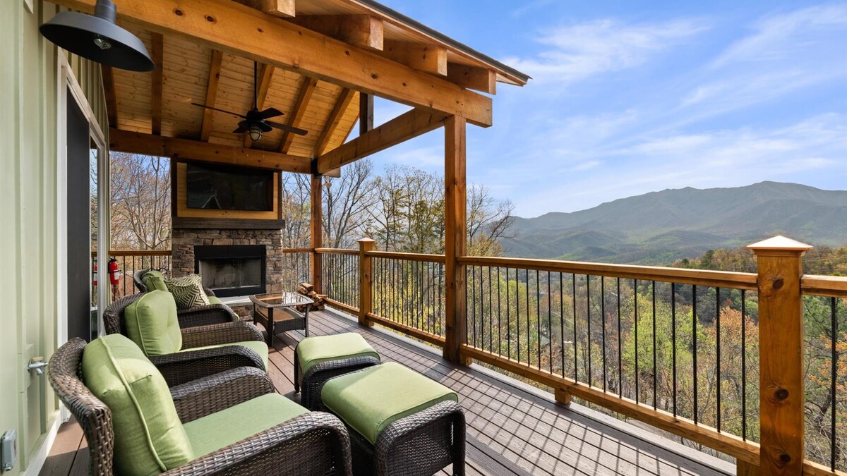 Escape to our luxury mountain chalet, where Smoky Mountain views and modern comfort await! Relax by the unique 3-sided fireplace, unwind in the living area with a 65” smart TV, or soak in the hot tub with panoramic mountain views. The gourmet kitchen with stainless appliances, espresso machine, and dining for 8 makes every meal memorable. Enjoy a game room with pool, multicades and even a rock climbing wall. The master bedroom features a tub by the window, offering breathtaking mountain views.