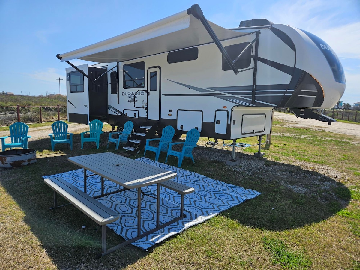Discover your perfect beach retreat in this spacious Durango Half Ton 5th wheel, set along a peaceful canal where the bay breeze and water views create the ultimate escape. Surrounded by the calm of the bay and just steps from the Gulf, this welcoming RV offers the perfect setting for family time, friends’ weekends, or simply a break from it all. The space: This thoughtfully arranged RV sleeps up to 6 guests and features a private queen master suite with a Smart TV, plus two additional queen pull out beds in the open concept living area, perfect for accommodating extra guests or kids with ease. The living room also includes another Smart TV and ample seating, making it ideal for game nights, movies, or simply relaxing after a sun filled day. The large kitchen is fully stocked and ready for anything from coffee at sunrise to dinner fresh off the grill. With generous dining space and plenty of seating in the open living area, you’ll have everything you need for easy, shared meals and entertaining. Outside, enjoy a private fire pit and a wide array of resort style amenities: fish or crab from the dock, paddle the canal with our kayaks, cruise around on bikes, or let the kids explore the pirate ship playground. The brand new palapa area is the perfect place to gather, complete with a grill, picnic tables, and cornhole.