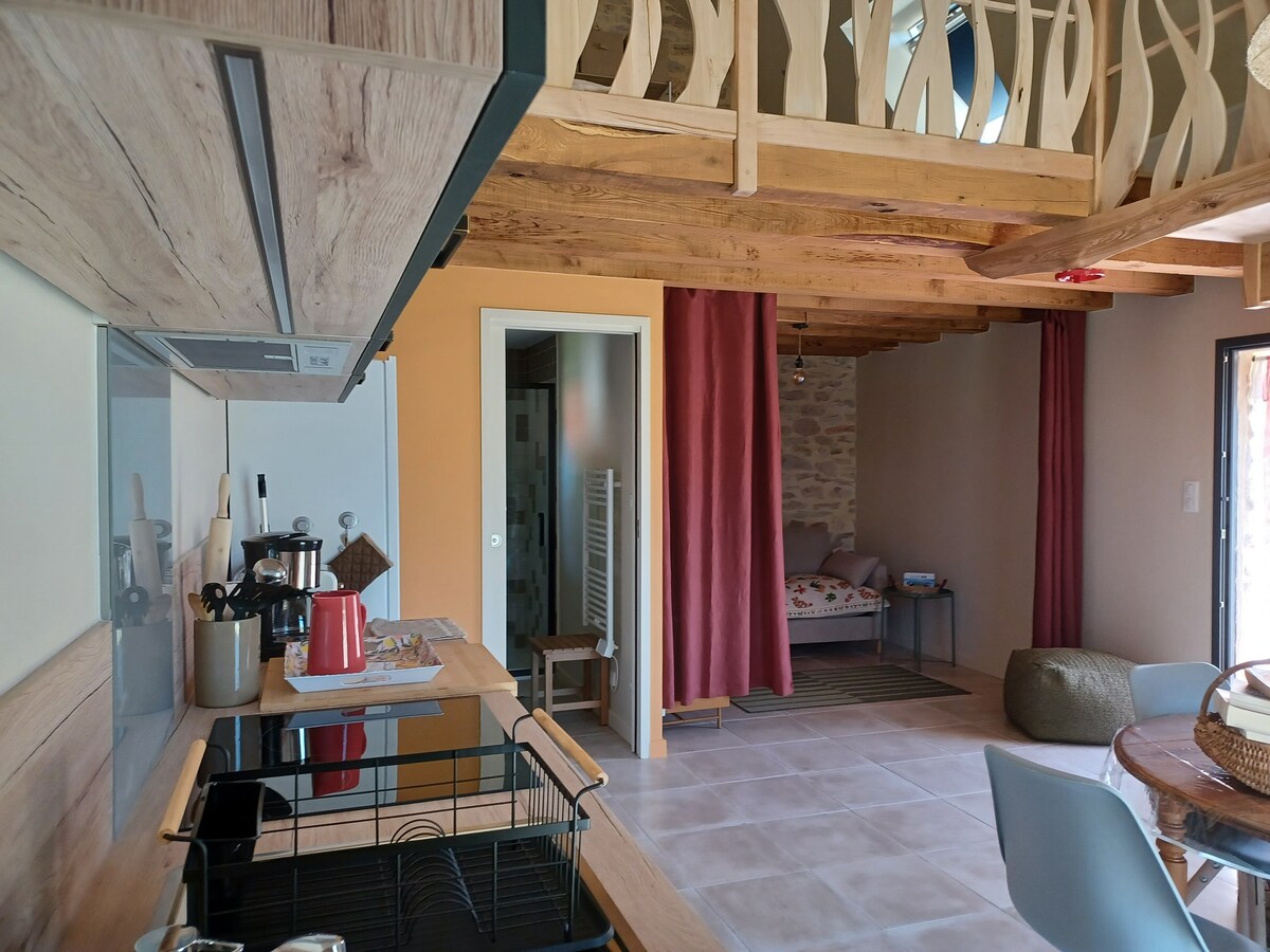 Lovely homestay studio with a spacious and bright room offering unobstructed views, a kitchenette equipped with a multifunctional microwave with grill (no stovetop), a Moulinex multi-cooker, a Senseo coffee machine, and a shower room. Guests can enjoy a terrace area and a private pétanque court, and a folding bed is available for children under 2 years of age.