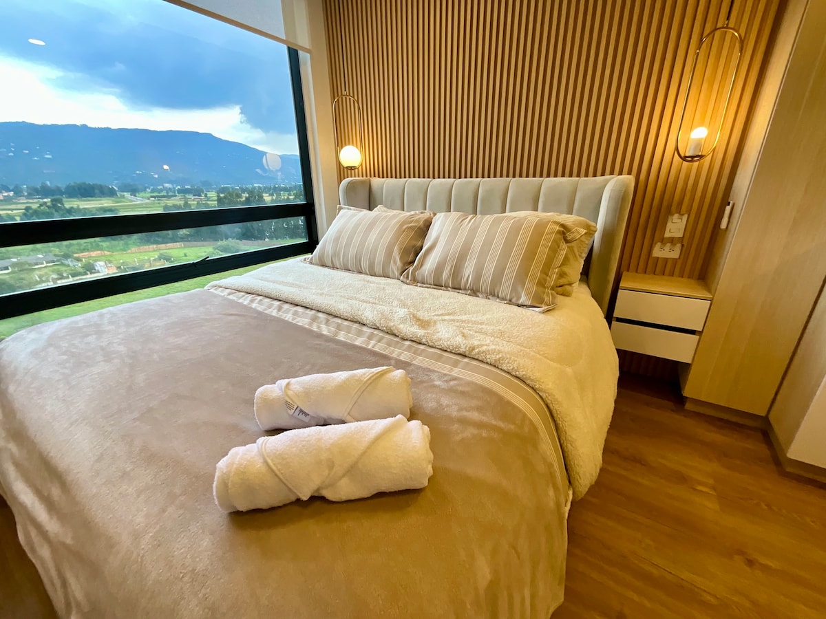 Modern apartment with a beautiful mountain view in Chia. With equipped kitchen, cable TV, Netflix and sound amplifier. Enjoy a cool and quiet space. Take a break from the city in a new apartment, open space. It has a garden, common room, terrace, BBQ, very well equipped gym and beautiful view. It has a parking lot, a coworking room, games and a movie theater. Close to the University of La Sabana, Centro Chia and Fontanar. Great location close to restaurants.