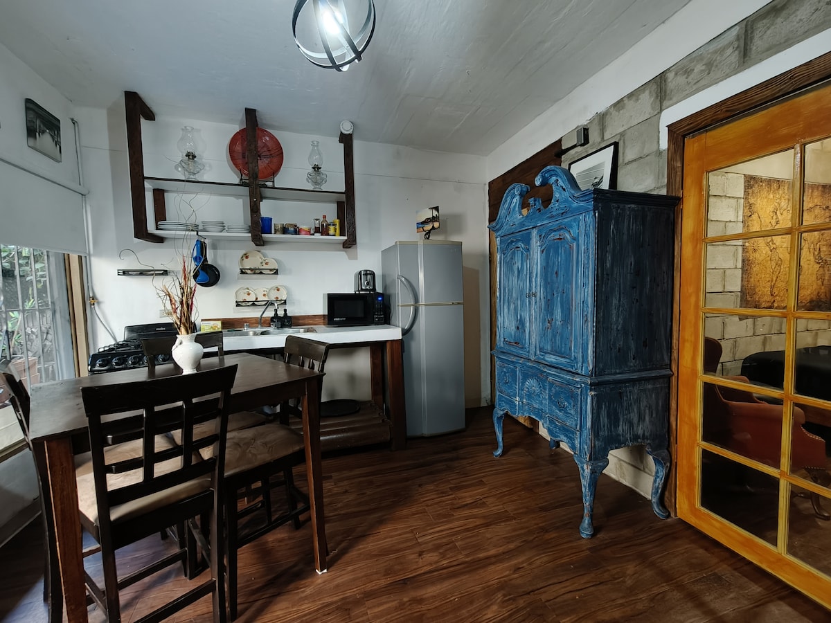 Guest house on property, outdoor smoking areas, outdoor gym. Art, fun, movie like experience with full cable, over 30 movie channels, DVD player, dinning table for eating or doing work. Extensive and secure business network. Cleaned, sanitized, checked after every visit. Full Kitchen, cooking utensils, Small 7.6 cu. ft. fridge, pots, pans and baking dishes for longer stays. Top notch Air conditioning and heating with plenty of extra blankets for your level of comfort. Your home away from home.