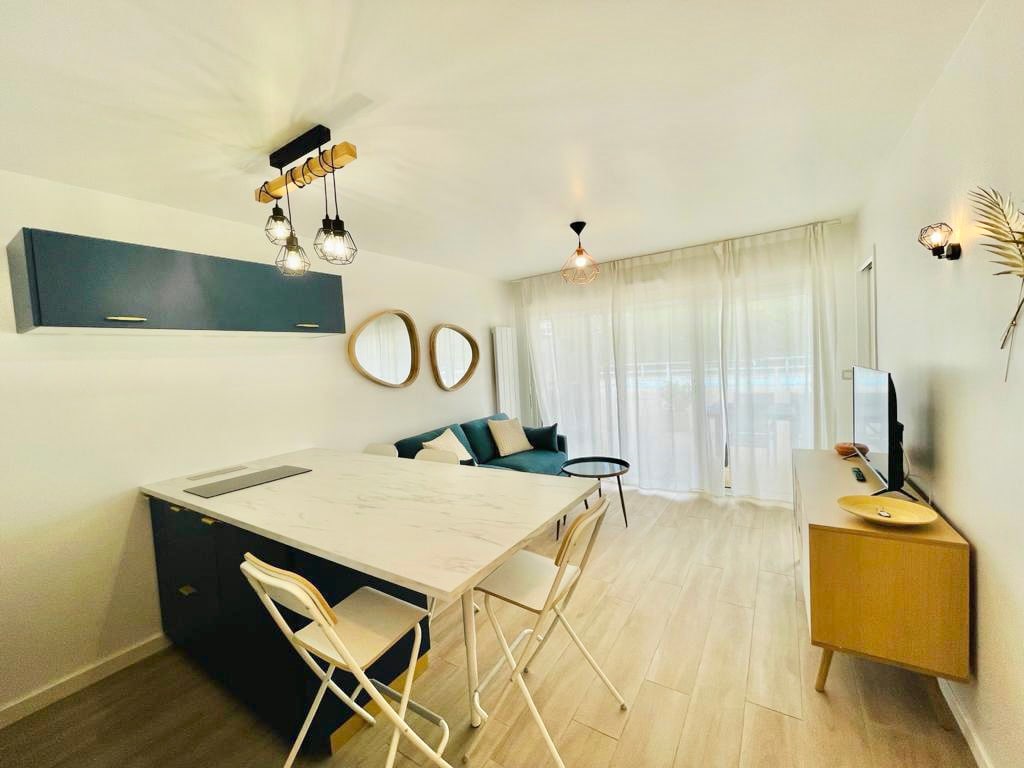 Beautiful 2 rooms with ocean view, terrace, 2 steps from the city center and beaches. Possibility of staying without a car. In a recent, luxury and secure residence on the 3rd floor with elevator access. Bedroom with 160 bed.