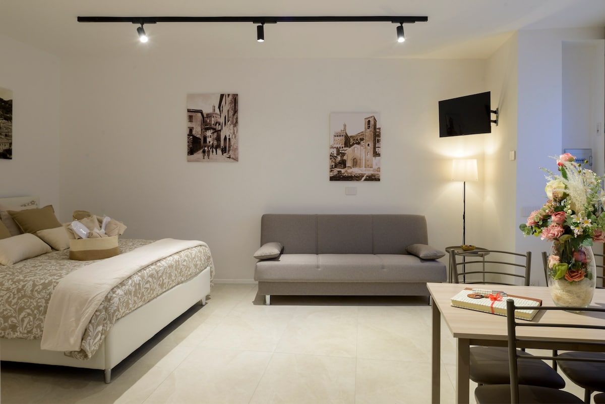 Casa Falcucci offers an elegant newly renovated studio apartment that, within the ancient Gubbian walls, combines a linear and modern style with a perfect combination of simplicity and elegance. Its strategic location allows you to reach the most beautiful views of fabulous Gubbio in just a few steps. The studio offers a beautiful kitchen, double bed, sofa, bathroom with shower, large closet and storage room, bathroom and kitchen linens included.