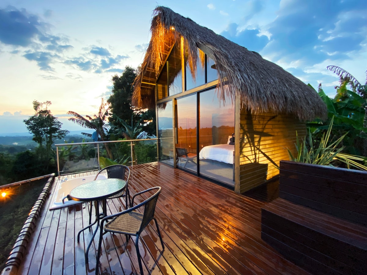 Enjoy our unique and tranquil Serenity Suite. Designed, specially to evoke a deep connection with nature, yourself, and your loved one; this is an experience you must live. The serene sounds of the mountains, and of the river below, the inspiring dawns, and the intense sunsets will give you an unforgettable stay. Spend your time in our finely decorated and furnished cabin, in our warm and soothing hut tub, and over our catamaran net. This will be a trip you surely won't forget.
