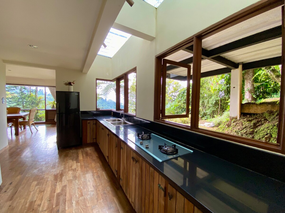 Escape the city to this private tropical house with stunning mountain views. Enjoy spacious rooms with large windows, a big terrace, outdoor dining area, billiard table, and fast Wi-Fi. Perfect for families, couples, or remote workers. Surrounded by nature, with spacious parking and secure CCTV. Easy access via alternative Puncak routeâyour peaceful retreat awaits!