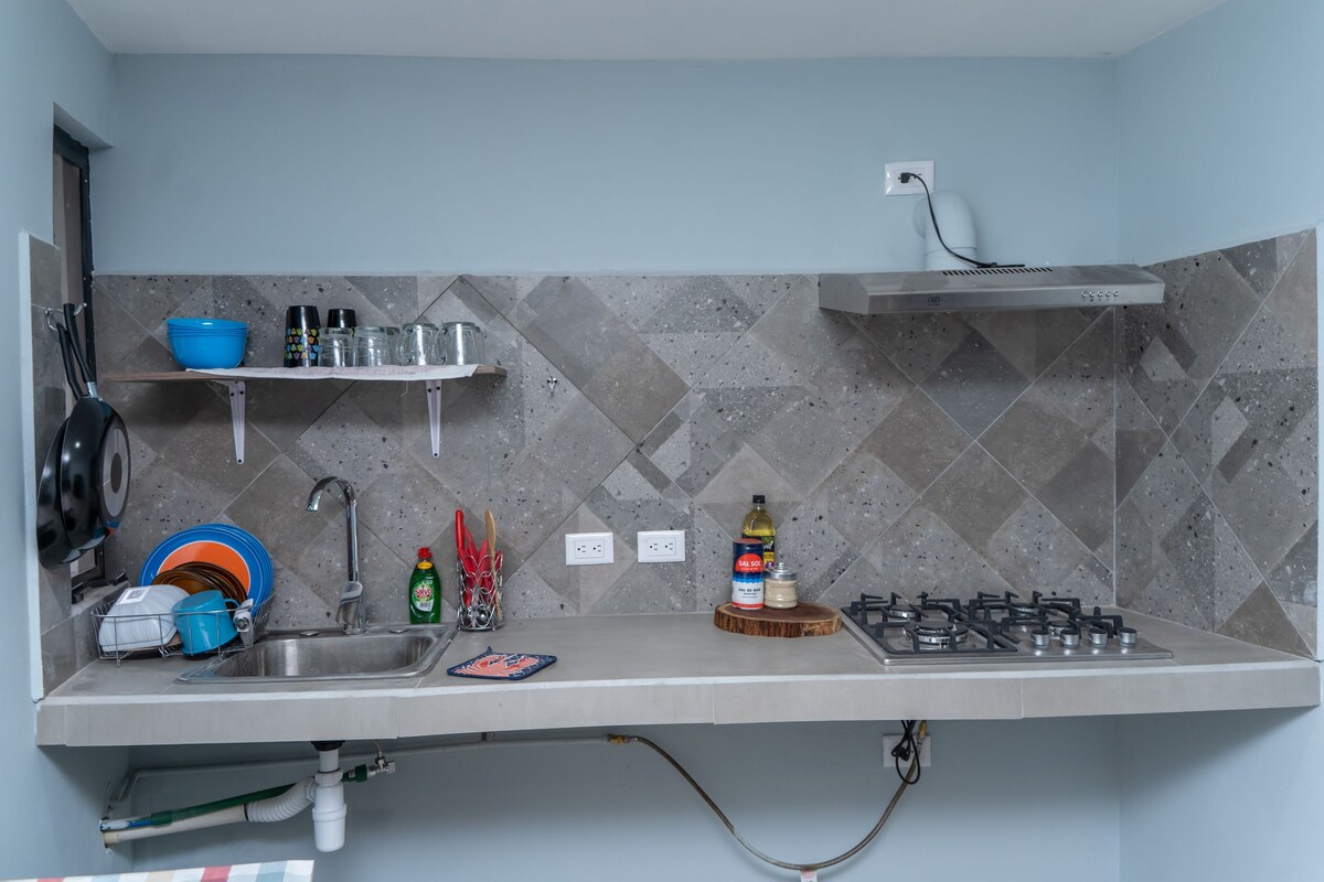 Brand new furnished loft apartment on the ground floor with 2 beds, one double and one single, A/C, Smart TV, WIFI and everything you need for an excellent stay. It has a small grill kitchen, refrigerator, blender, coffee maker, dishes, glasses, mugs, pans and utensils for cooking. It is located in a very quiet, well-lit and very walkable neighborhood with easy access to points such as self-service stores (Chedraui Oxxo Pizzeria)