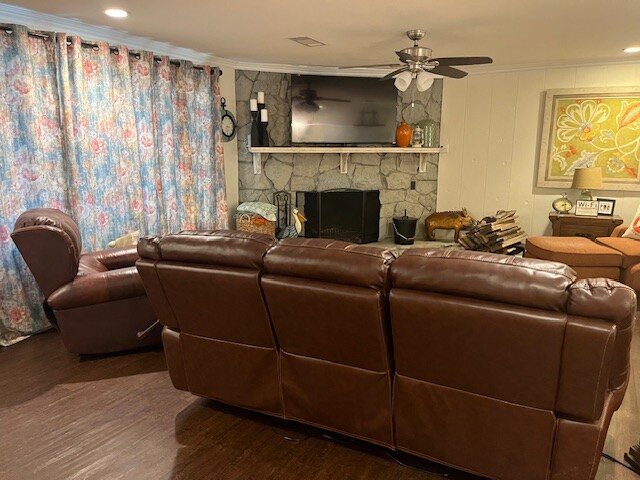 An open living area is showcased, featuring a comfortable seating arrangement with leather sofas and a brick fireplace. The kitchen area is illuminated and comprises wooden cabinetry, a center island with bar stools, and modern appliances, offering a blend of functionality and warmth.
