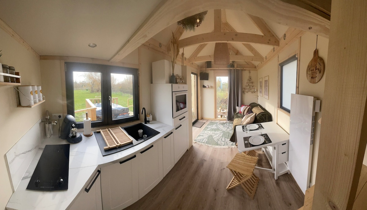Omer Tiny is conveniently located to discover Audomarois and its surroundings. The 20 m2 accommodation has been optimized to accommodate you in optimal conditions. Parking space, terrace, PRM access for entry into the accommodation. The tiny house has an equipped kitchen, a bathroom with walk-in shower, toilet. A quality sofa bed and a mezzanine that can accommodate 2 people. Facing south, you'll have access to a 2000 m2 plot bordered by water but secure for your children and pets.