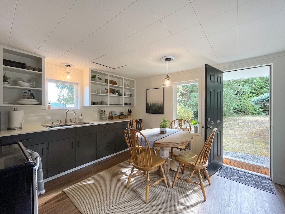 Comfortable step-free 400 sq ft studio-style cottage with open concept. Scenic 5 acres in between Sequim and Port Angeles, guests have the perfect location to be close to the Olympic National Park, hikes and tourist attractions. This cozy home-away-from-home features a walk in shower, full kitchen (stocked w/essentials), air conditioning and heat, outdoor patio, queen sized bed, twin sleeper sofa, electric fireplace, TV and hi-speed Starlink Wifi. Cottage built from mostly repurposed material!
