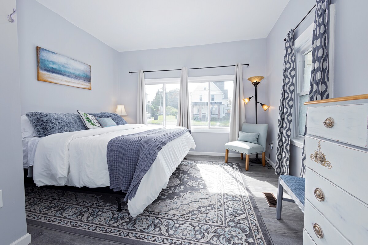 Restful comfort awaits you on a quiet street in quaint Akron Village! Off street parking for two cars. King & queen beds, hypoallergenic bedding, on point décor, Smart TV's, WIFI, separate office, fully outfitted kitchen, outdoor grill/table. 5 min to Sterling, Timberlodge & Akron Acres wedding venues, 10 min to I-90, central to Buffalo Airport, downtown Buffalo, Niagara Falls, Letchworth, Six Flags Darien, skiing, golf! Shops, bike path & Akron Falls Park are within walking! SEE MY GUIDEBOOK!